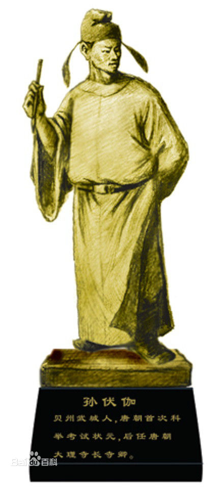 隋朝灭亡,李渊称帝后,在唐武德年间孙伏伽降顺了大唐王朝。在唐武德五年(公元622年)举行的科举考试中,他从30名应试的举子中脱颖而出,科举甲榜第一名状元及第。“玄武门之变”中,孙伏伽站在了李世民一边,鞍前马后地奔走效劳,为李世民政权的巩固做了不少的事情。李世民即位后,马上赐孙伏伽男爵爵位,食邑乐安。贞观元年(公元627年),提升为大理寺少卿(最高法院副院长,常设二人)。