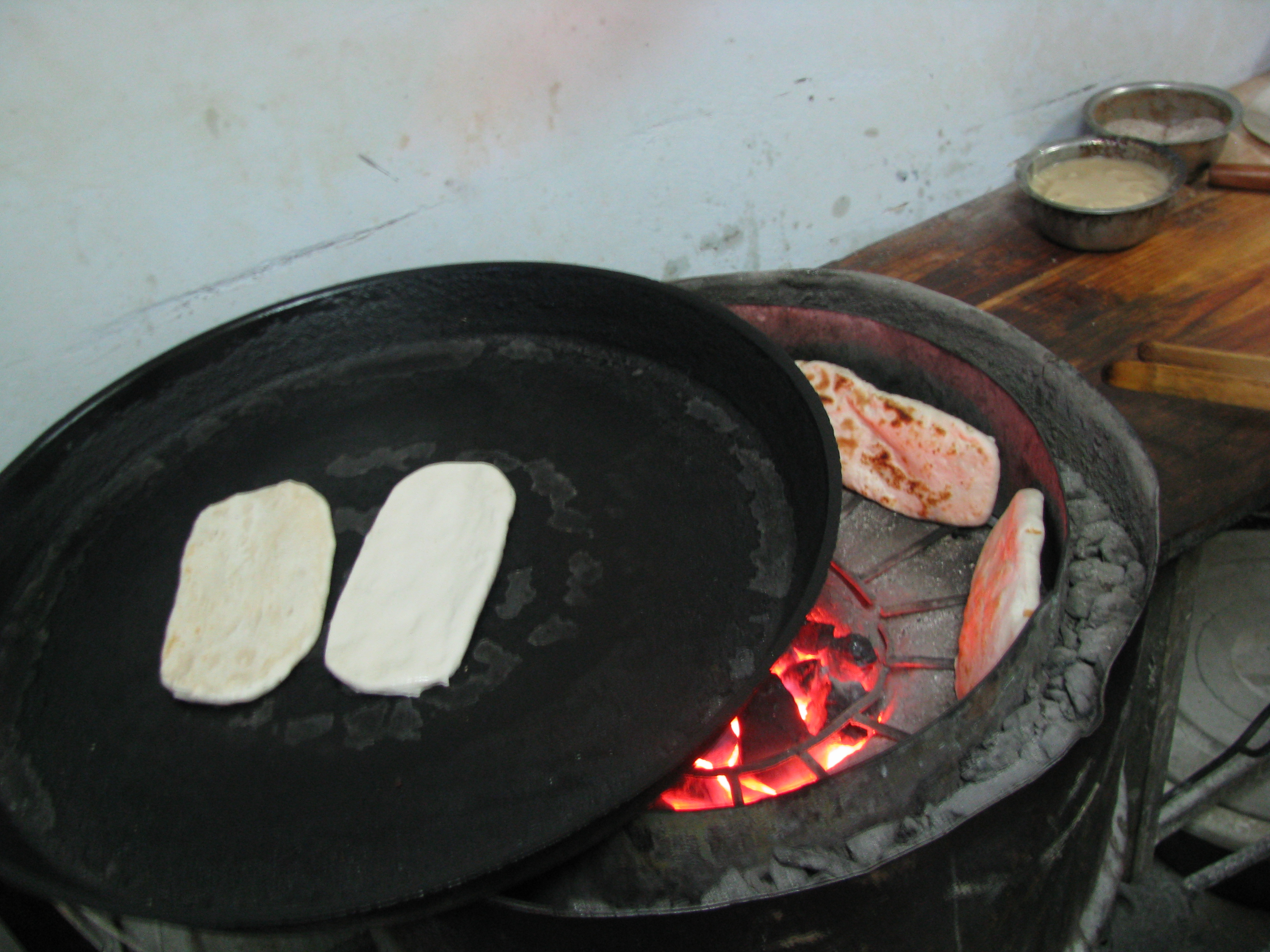 制作鞋底火烧的烤炉是特制的铁桶炉,上面一个大饼铛,炉膛凹进去半尺,中间套一个铁圈,里面有一个微凸的铁箅子(烤炙时防止烧饼掉进炉膛里),七八寸大小的炉口,燃大块煤。也有烧蜂窝煤的,灶膛里面有三个炉口。鞋底火烧是半发面的,工艺从狗不理包子借鉴而来。在长期的实践中,做鞋底火烧的师傅们总结出了一套经验:面发过了火烧发酸头,破坏了小麦原有的味道;用死面火烧发硬,不易消化。用半发面烙出来的火烧筋道发甜头,还能保持小麦特有的纯香。鞋底火烧的主要原料是普通面粉、特制椒盐、麻酱、香油等。和面时加入适量的清水,面要和得不软不硬。冬天需用酵子发面,至半开,稍搁点碱面中和一下酸碱度;夏天便不用酵子,直接饧置一定时间,就可使用了。制作时,将面团上案板揉匀,用小刀切下一块面,擀成长条,搁油、撒调料,像卷被窝卷一样卷起来,头上略略擀两杖,把饼卷一包,擀成圆饼,在手上一抻,抻成长圆形,放进饼铛里,烙至两面挺实,再放进炉膛,紧贴四壁,烤至两面微焦,肚子鼓鼓得像一个个充气小枕头,就可以出炉了。整个制作过程只需三四分钟。