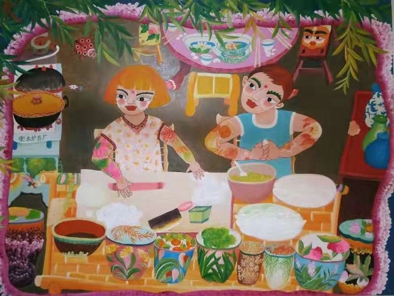 晚上,张洪信经常在油灯下给儿女画小猫、小狗、小鸟、大树、花草,哄他们玩。