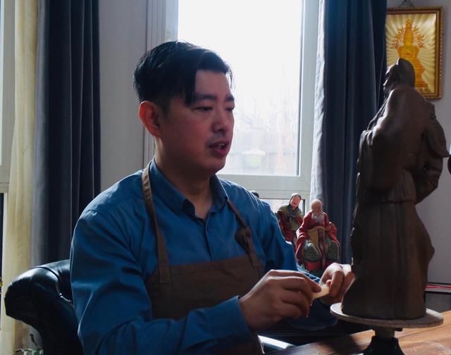 冬日微弱的光从窗户溜进来,张宇左手转动着一尊泥塑,右手中的“压子”不断与它触碰。于是,眉宇展露轩昂,衣带渐次飘逸,一座关公像开始鲜活。