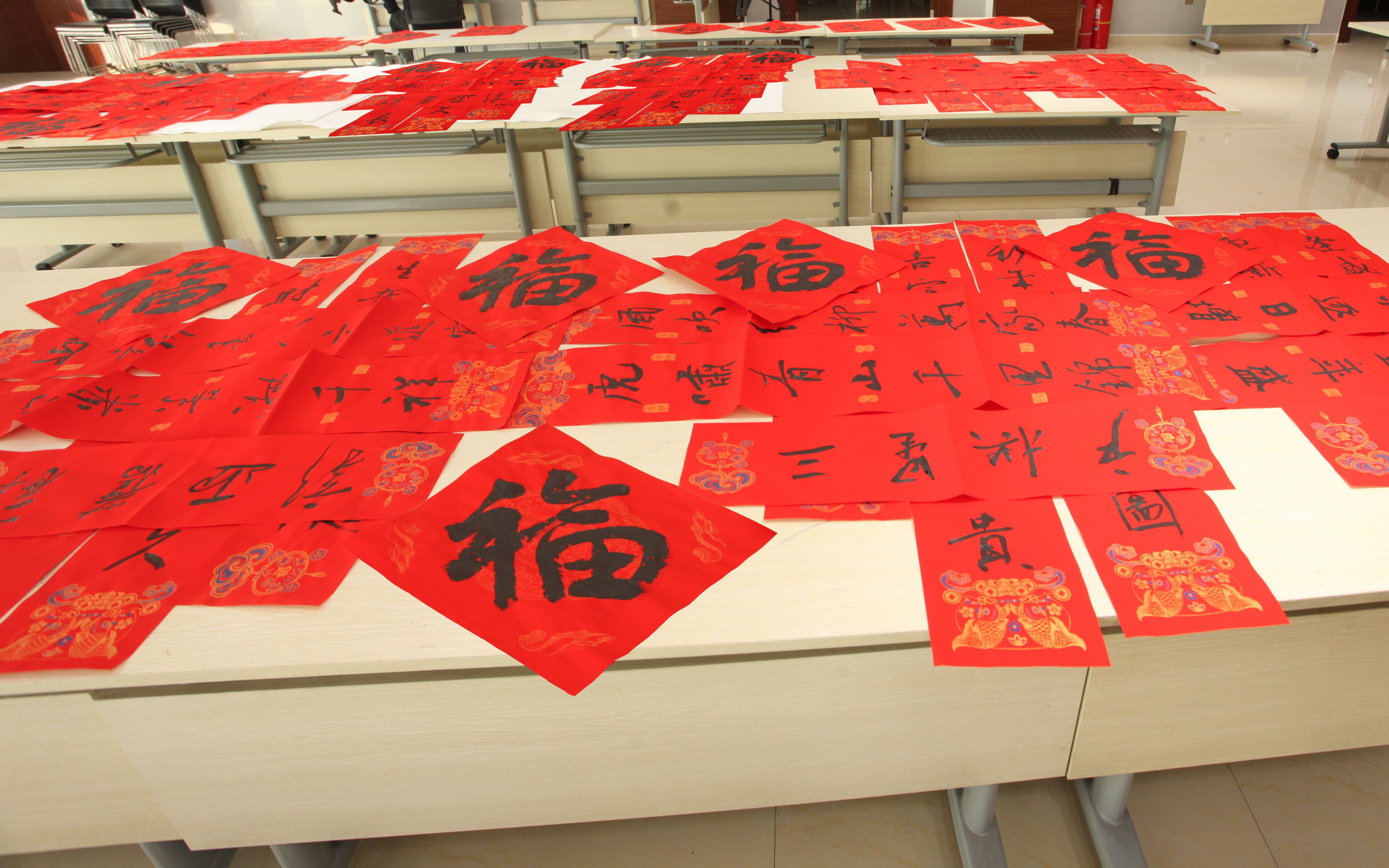 这天是侯店大集,侯店村周围20多个村的村民前来赶集,大街上摩肩接踵,熙熙攘攘。“咚咚咚、锵锵锵”,王文申毛笔厂门口的锣鼓队敲锣打鼓,吸引来众多村民。大家听说,毛笔厂大厅里聚集着众多书法家,在义务写春联,都高兴地进去观看。大厅里,尹海金、杜长荣、张书琴、吴来峰、薛明君等30位书法家伏案挥笔,书写“福”字和对联,写完便有人将其小心翼翼地铺展在地上、桌上晾干。“喜居宝地千年旺 福照家门万事兴”“春临玉宇繁花艳 福到门厅喜气盈”“创大业年年得意 展宏图事事顺心”等一幅幅饱含新春祝福与良好祝愿的对联,令村民们连连赞叹。大家观赏着、挑选着,将各自喜爱的对联、“福”取走。有的甚至等不及晾干就将对联带回了家。