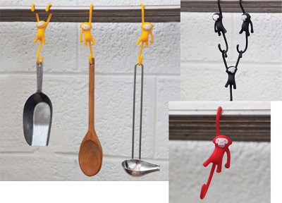 厨房空间相对较小,但所用的厨具却是五花八门,利用好空间便可以让厨房整齐有序。墙壁是不可忽视的收纳空间,在墙壁上设置挂钩,便可以将勺子、锅铲等多种工具收纳至墙面。这款猴子挂钩巧妙地将猴子悬挂在横架上,尾巴是挂钩处,有趣又实用。