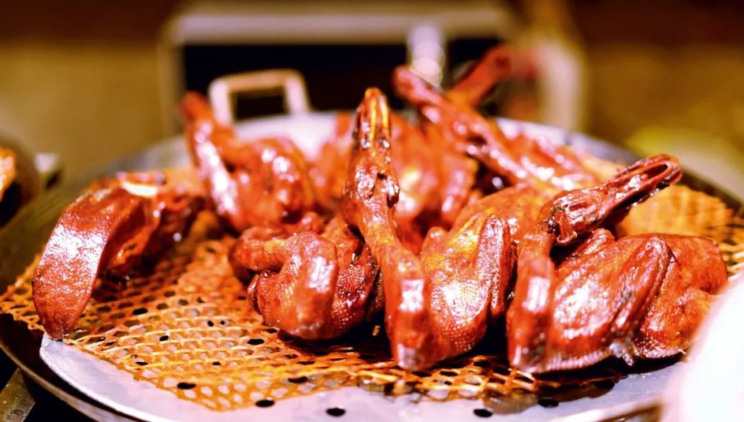 刚烤完的鸭子,一刀刀片好,皮肉分离。鸭皮蘸糖,放入口中,无须咀嚼,鸭皮入口即化,酥香悠长的回味在齿间弥漫。