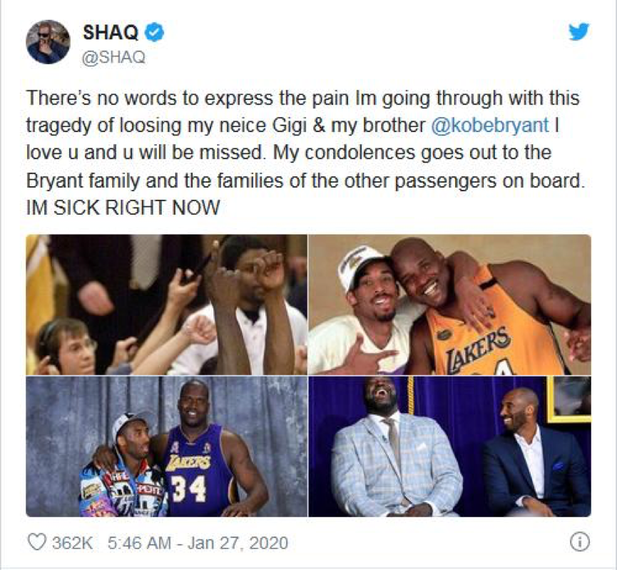 科比的前队友、篮球名宿奥尼尔在社交平台发文悼念