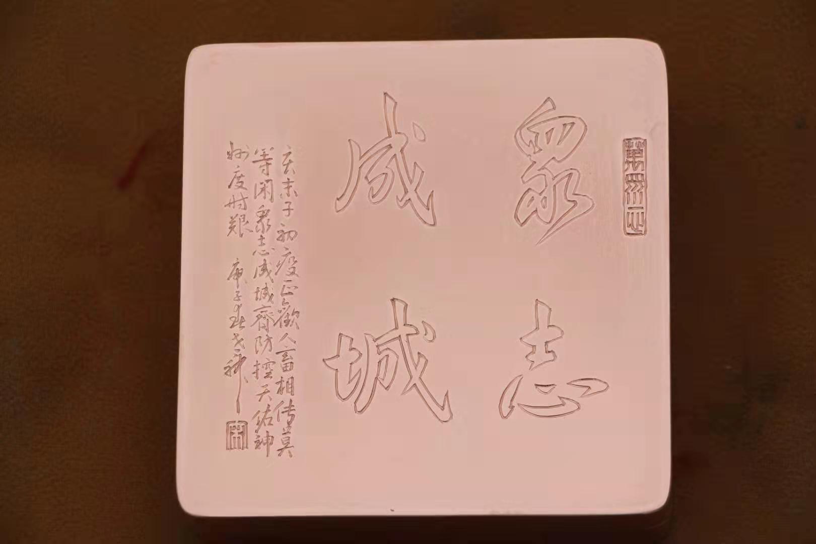 决定进行创作时,宋国柱先生还在饶阳老家,而刻刀工具、墨盒材料等都在市区工作室。疫情就是命令,于是他多方寻找,终于联系到一辆回市区的车辆,匆匆赶回工作室,夜以继日地忘我创作,一方以“众志成城”为主题的刻铜墨盒终于在他激情、奋悯的冲动中创作出来,宋国柱还为此赋诗一首刻于其上:亥末子初疫正欢,防控疫情莫等闲。众志成城齐防控,天佑神州度时艰。