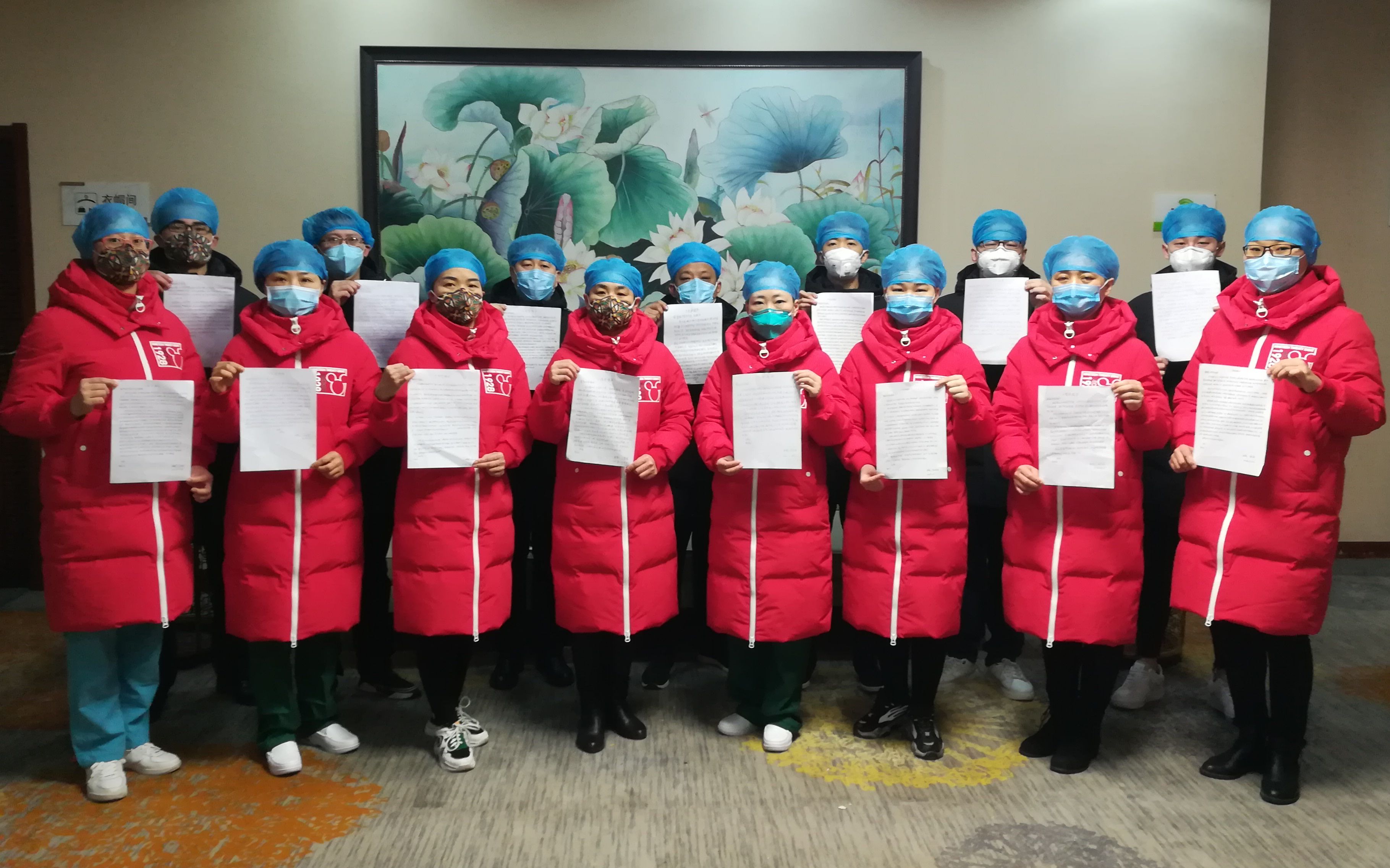 经过紧张的培训,我终于和战友们一起战斗在武汉洪山体育馆方舱医院抗击肺炎疫情的第一线。今天,我们十五名支援湖北医疗队成员在带队队长张宏亮的带领下,一起郑重写下了入党申请书。我们就是要像身边的共产党员那样勇敢去战斗,守护人民群众的生命健康!