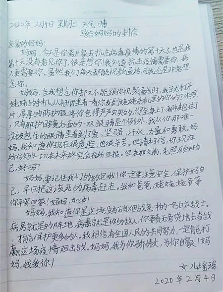 妈妈,今天是您离开家去抗击病毒疫情的第十天了,也是我第十天没有看见你了,很是想你,我知道抗击疫情需要你,病人更需要你,虽然我们每天都能视频通话,可是我还是非常想念你。