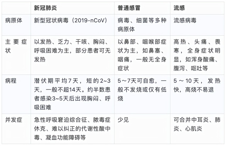 新冠肺炎早期患者,以头痛、咳嗽、打喷嚏等为主,这些症状普通感冒和流感也有,但三者之间还是有区别的。