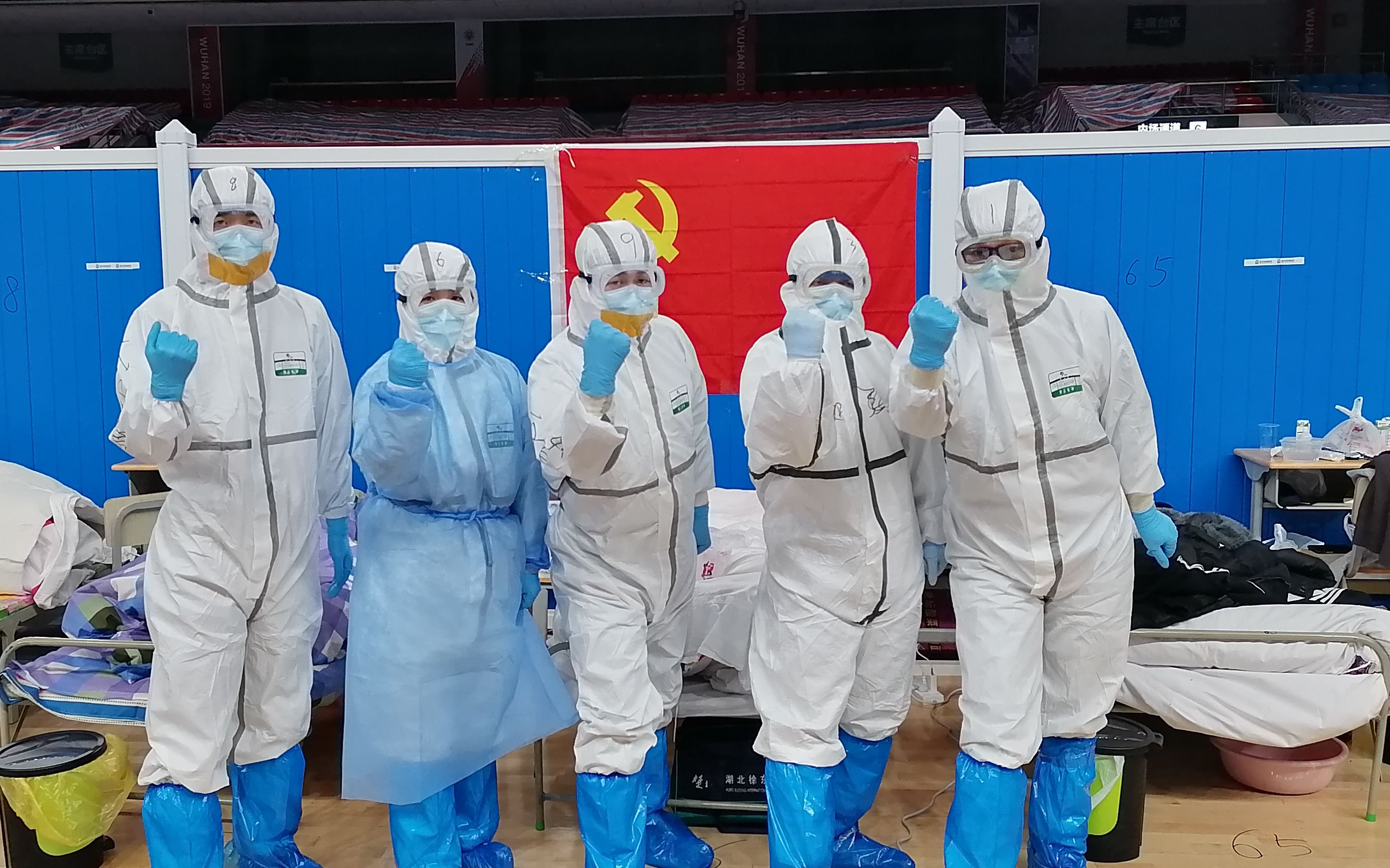今天病区墙上多了一面党旗,是66床的患者张兵和几个病友挂上去的,他说自己虽然是患者,但更是一名党员,他相信在党和政府的领导下,一定会取得这场战“疫”的胜利。看到这面旗帜,我感觉自己浑身的血液在沸腾,身体所有的不适一扫而光,组员们的精气神也顿时受到鼓舞。前几天我们刚刚写好入党申请书,尽管我不是共产党员,但能够在这面旗帜下宣誓是我们这支医疗队队员们共同的心愿。