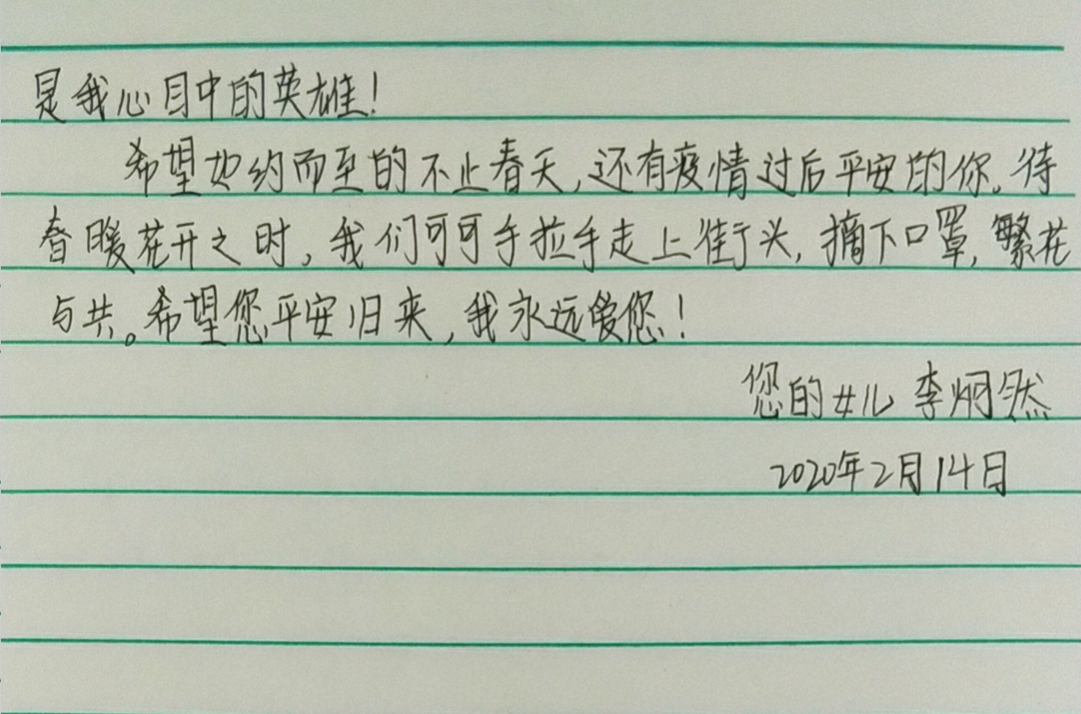 时间让思念更加醇厚,距离让心灵愈加紧密。出征武汉抗击疫情的母亲,在家听话懂事的女儿,当思亲情浓不能自已时,女儿拿起笔用真挚质朴的语言,写了一封爱的家书,向远方的妈妈诉说思念、崇敬和祈盼之情。一句句简单的话语,温暖直抵人心!