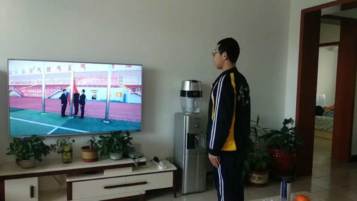 “我们万众一心,冒着敌人的炮火,前进……”,2月17日上午,几千名衡水二中学生在家中同时面对视频中升起的五星红旗,庄严站立,高唱国歌,举行了一场网络升国旗仪式。