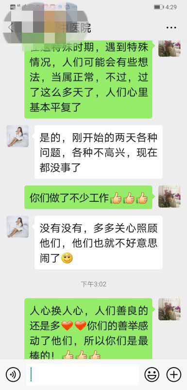 2月4日晚,一名护士给她打电话,一例被确诊患者的母亲躺在床上一句话也不说,也不吃东西,眼神迷茫。护士们也不知该怎么做工作,恐怕说的不恰当对隔离人员造成不利影响。黄秀芹告诉护理人员:这位母亲对自己儿子担心忧虑,恐怕儿子病情发展恶化,担心家里会不会还有他人会感染。对她这种担心应当给予理解,要经常问她有什么需要,尽管她不说话,但是在日常生活方面尽量鼓励她讲出来,不怕说的少,只要说就可以;可以利用亲情,让孙子孙女多给奶奶打电话扰动她的生活,让她的老伴多多电话交流,尽量多给她儿子病情好转的信息,给她生活的希望。按照黄秀芹的办法,这位老母亲在护理人员的精心照料下,终于慢慢解开了心结,知道儿子病情正在好转,老人家也愿意和护士简单对话,能够自己料理生活起居,慢慢走出了疫情的阴影。
