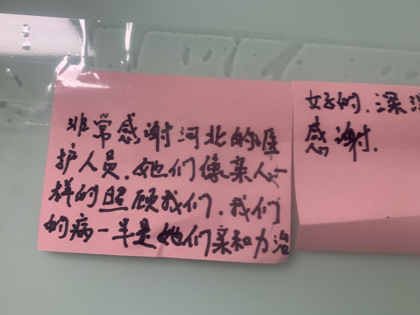 齐娜说,她最喜欢看的就是病区那面特殊的“留言墙”,墙上密密麻麻地贴满了五颜六色的暖心卡片,卡片上是患者们手写给医护人员的感恩和祝福:“非常感谢河北的医护队员,他们像亲人一样地照顾我们。我们的病一半是他们的亲和力治好的。深深地感谢!”“感谢医生护士的精心照顾,你们辛苦了!”“为本院与驰援的河北医护人员点赞,你们是真正的白衣天使。”每次看到这些暖心的卡片,齐娜的心中都会充满无限的力量。她说,这些卡片的背后,是他们与患者之间逐渐建立的深厚感情。其实,像这样医患情深的故事每天都在武汉上演。