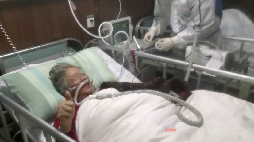 一位老年患者病情比较重,入院后一直戴着无创呼吸机,齐娜给她更换了经鼻高流量,这个仪器没有无创呼吸机面罩对面部的压迫,比较舒适,也能提供高浓度氧。患者不断地表达着感谢,向她伸出拇指说:“我是共产党员,我爱我的国家,我爱我的党,我更爱你们,希望你们平安回家”。患者的话语字字落入齐娜的心里,让她充满了动力。