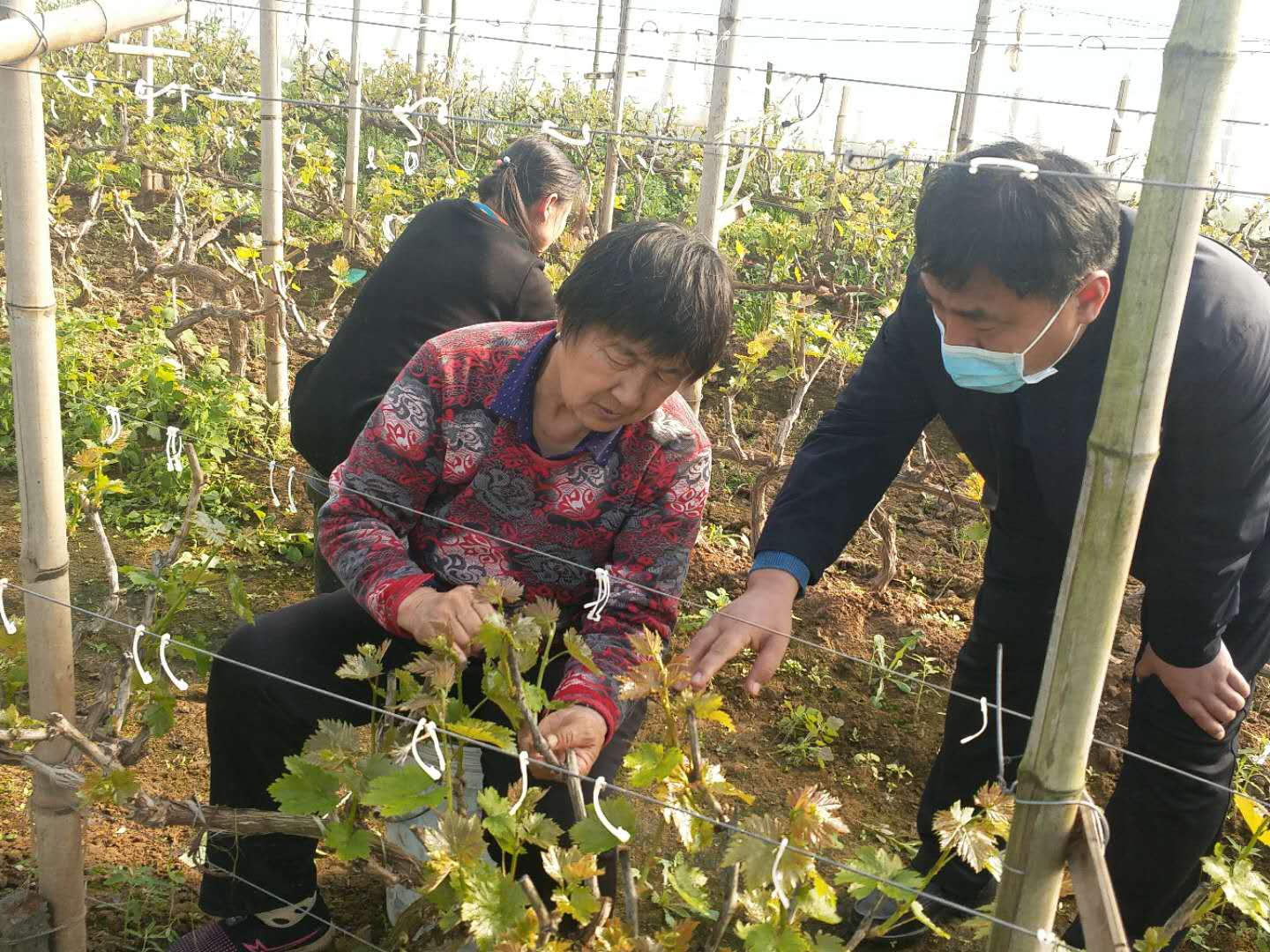 2月22日,阜城县蒋坊乡来海葡萄种植合作社内,一个个整齐排列的大棚在阳光照射下,随风起伏、银光闪闪。棚内葡萄长势喜人,枝条已有五六寸长。几名戴着口罩的妇女正忙碌着掰叉整枝。