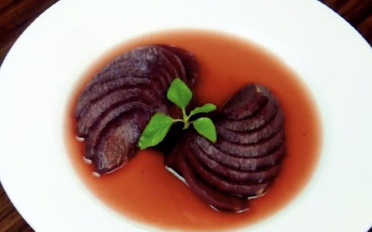 这道用沙梨制作的菜,光是“颜值”就很惊艳。梨子在红酒的浸泡下分外鲜艳,红酒浓郁醇美,梨子爽口酸甜,绝对不会辜负期待。做这道菜只需要一杯红酒、两个沙梨。沙梨一切为二,泡入红酒6小时以上取出切片摆盘。