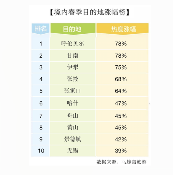 马蜂窝大数据显示,今年第一季度,境内目的地季度环比涨幅榜前六位均被草原类目的地包揽。其中,作为国内开发最早的草原目的地之一,呼伦贝尔的旅游关注度在第一季度上涨78.4%,成为春季旅游关注度涨幅最高的国内目的地。甘南、伊犁、张掖、张家口的旅游关注度涨幅也均超过50%。马蜂窝数据研究中心负责人马禹涛表示,内蒙古、甘肃、新疆等目的地或将在疫情结束后迎来客流高峰。