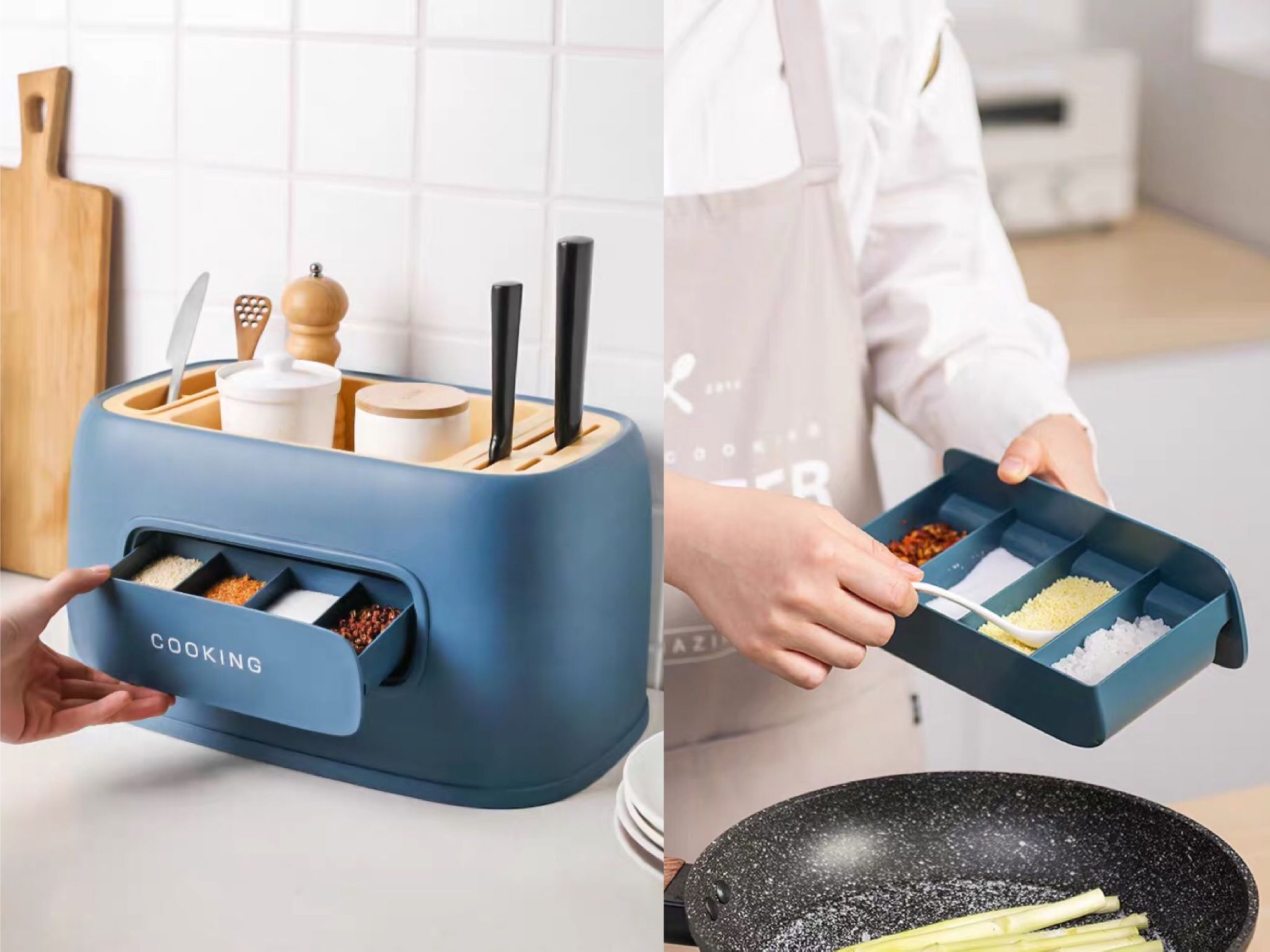 上层可以收纳餐具和厨具,下层可以作为调味料盒,各种刀具、筷子、勺子、调味料都能各归其位,放置、取拿都更加方便。左边放置筷勺、右边放置刀具的设计,也贴心地考虑到了使用习惯,中空沥水可以防潮,防止细菌滋生。四格连体的密封调料盒操作便捷,不易受潮。