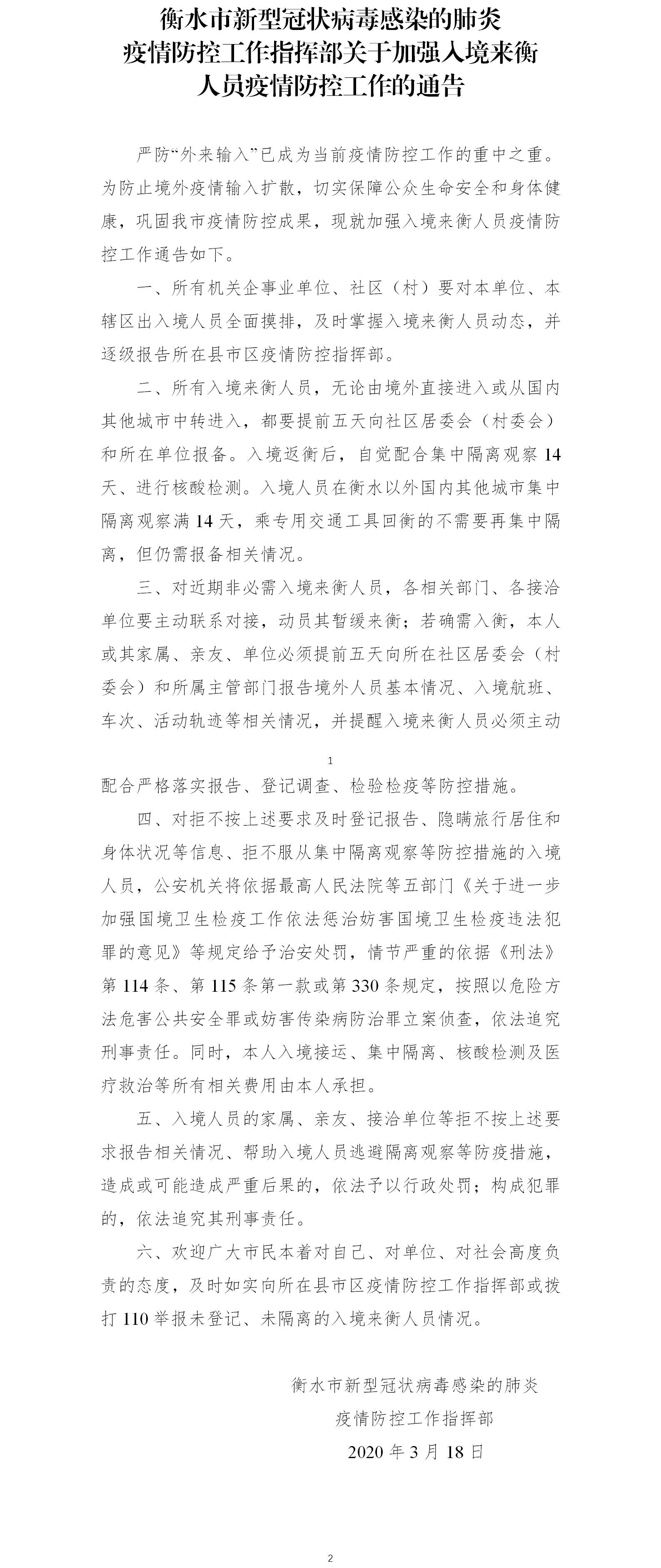 严防“外来输入”已成为当前疫情防控工作的重中之重。为防止境外疫情输入扩散,切实保障公众生命安全和身体健康,巩固我市疫情防控成果,现就加强入境来衡人员疫情防控工作通告如下。