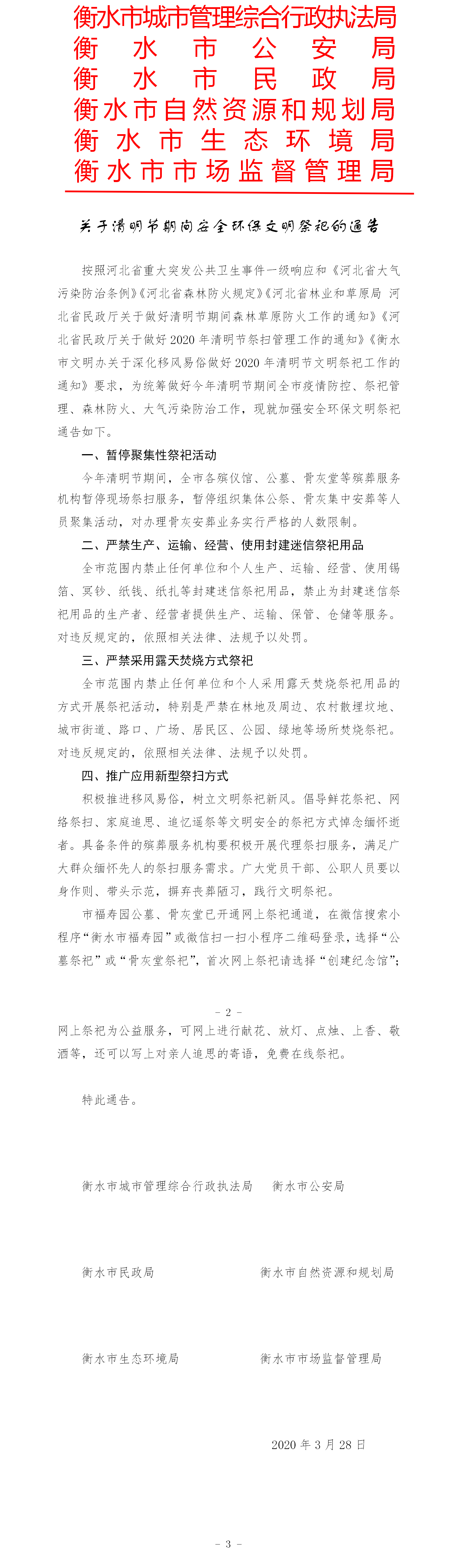 按照河北省重大突发公共卫生事件一级响应和《河北省大气污染防治条例》《河北省森林防火规定》《河北省林业和草原局 河北省民政厅关于做好清明节期间森林草原防火工作的通知》《河北省民政厅关于做好2020年清明节祭扫管理工作的通知》《衡水市文明办关于深化移风易俗做好2020年清明节文明祭祀工作的通知》要求,为统筹做好今年清明节期间全市疫情防控、祭祀管理、森林防火、大气污染防治工作,现就加强安全环保文明祭祀通告如下。