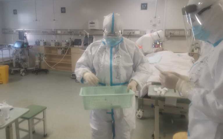 我们对口支援的诊疗医院是武汉市第七医院,一所二级医院,也是被确定首批新冠肺炎患者的定点诊疗医院。初到的两天里,国家卫健委专家来给我们讲授新冠肺炎的防控知识。自28日开始,医疗队分组分班次开展工作。分配任务的时候,领导考虑到我来之前在心内科工作,把我安排在普通救治组。我当即提出申请一定要留在ICU,虽然重症病房任务重、风险高,但我以前在ICU进修过,比大部分队员年长,护理经验相对多一点,更适合留在ICU。