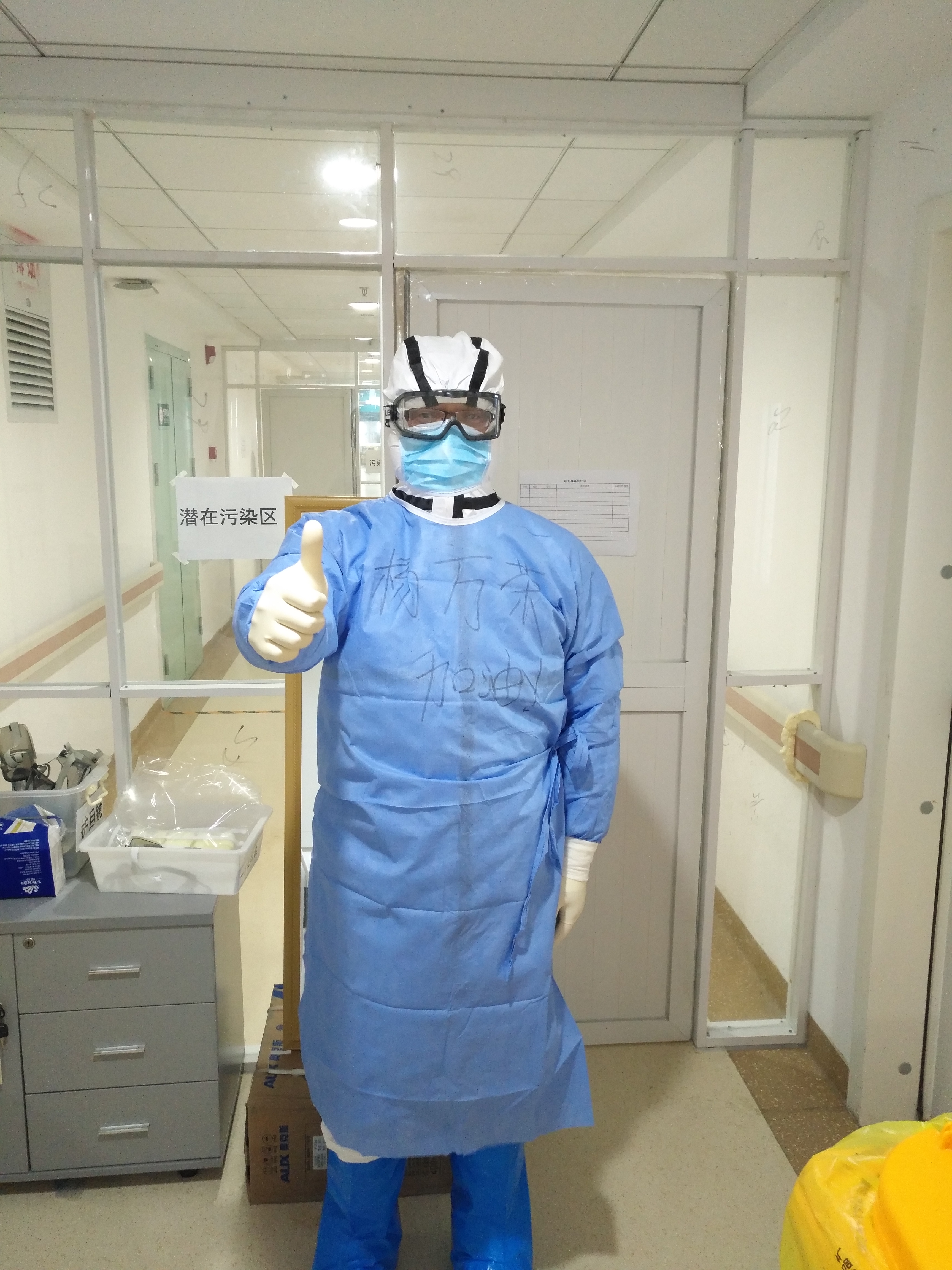 首次进入污染区,也就是隔离病房,是在胡芬主任带领下进行工作交接,当她得知我没有刷手衣时,亲自将她未穿的刷手衣送给了我,还让护士长为我找了一件白大衣!接下来,无数次的训练终于迎来了实战,穿防护服进隔离病房,熟悉工作流程,虽然过程中遇到了种种问题,但幸亏有感控老师为我们监督帮忙。另外,为了能认出彼此,队员们相互在防护服上写上姓名及“加油”,以鼓励打气,并以最好的状态进入工作岗位。