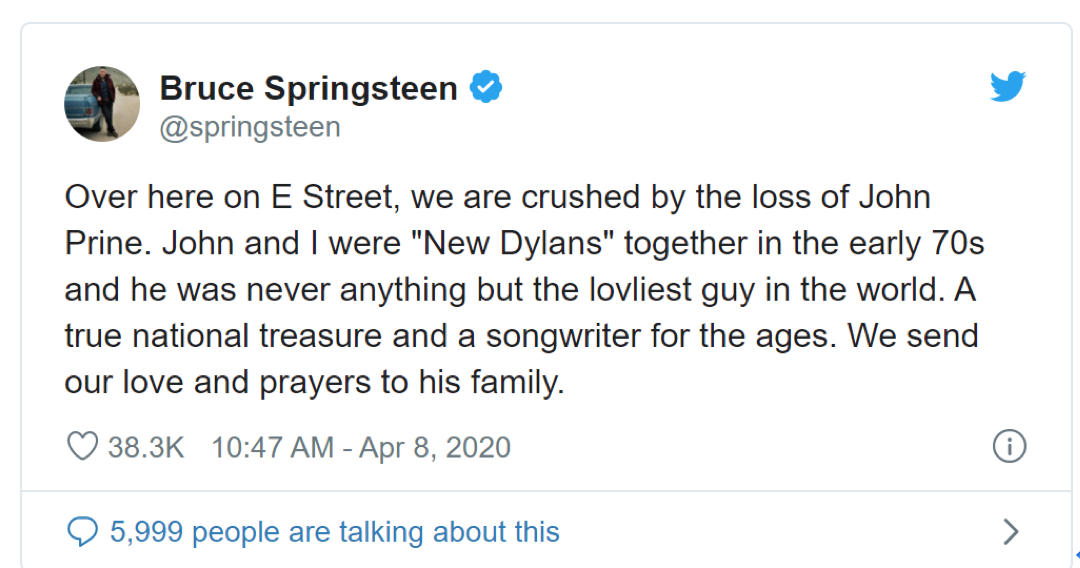 美国著名民谣乐手、词曲创作人约翰·普莱(John Prine),因感染新冠肺炎于4月7日逝世。