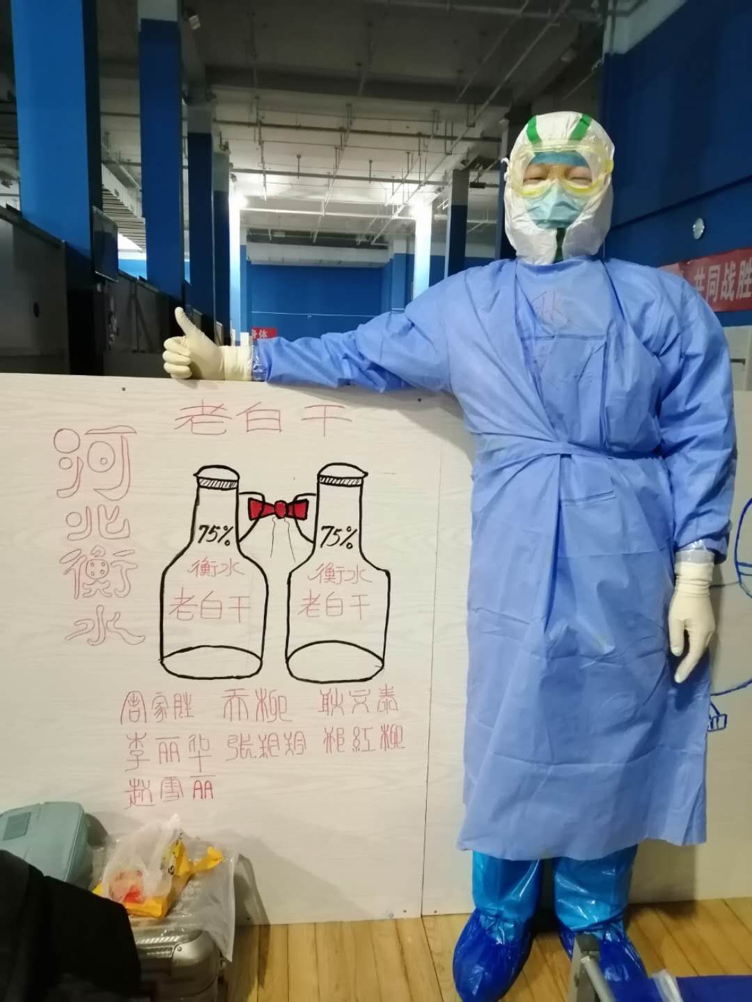 忘记了那是第多少次进舱,也不曾留意护目镜上的水雾,我只知道,有些人在一直默默得关心着我们。有一位患者,大概是看我们太辛苦,为了给我们的工作增添点小色彩,专门画了一张“衡水老白干”的画儿送给我们,还附上了我们几个同组同事的篆书名字,他说,有机会去衡水找我们喝酒。瞬间,一股暖流冲入心底,让我们知道所有人都在默默努力着,向着胜利的那一刻。