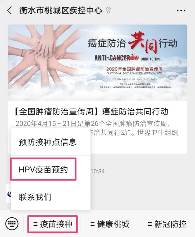 为做好新冠肺炎疫情防控期间HPV疫苗接种工作,避免人员聚集,衡水市桃城区HPV疫苗接种开启预约接种工作。本次四价HPV疫苗预约名额为200名、九价HPV疫苗预约名额为224名,全部实行网上预约,不接受电话和现场预约。市民可关注“衡水市桃城区疾控中心”微信公众号(疫苗接种—HPV疫苗预约—选择接种单位—选择四价\九价)进行预约。开放预约时间为:2020年5月9日09:00—11日17:00。