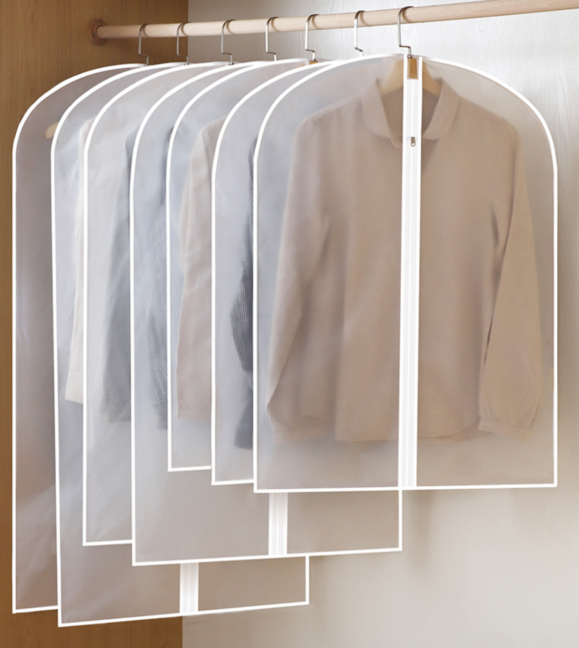 有些材质的衣物并不适合折叠存放,悬挂是最好的放置方式。而过季衣物不常穿,为避免落灰,可选用透明防尘罩将衣物包裹悬挂。同时也便于辨识衣物,不用在衣橱中翻看寻找想穿的衣服。