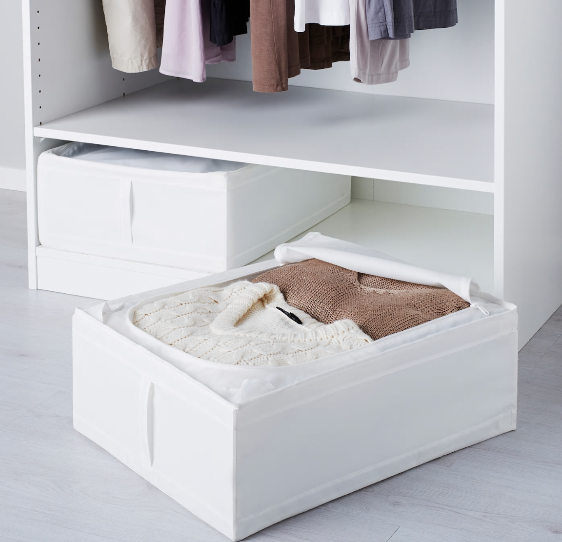 夏日温度上升,轻薄的夏凉被登场。一个储物盒可以将厚棉被收纳起来,存放位置可根据收纳习惯,将其置于衣橱高处或床下等空间。这款储物盒自带拉手,方便拉取。角落的通风网能促进空气流通,让存放的衣物和纺织物长时间保持清洁。