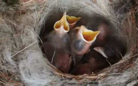 又过了十来天,我进门看到大鸟不在巢穴,便仔细观察起来。啊!小鸟孵化出来了,一听到声音,鸟宝宝便纷纷昂头向上,等待喂食。鸟巢由柴草搭建而成,中间凹下,内壁像精致的茶杯,巢内周边整齐,里层铺有柔软的羽毛,几只雏鸟簇拥在一起,张开黄嫩的嘴巴,嘴巴好像比头还要大,身上长有稀疏的月白色绒毛,煞是可爱。
