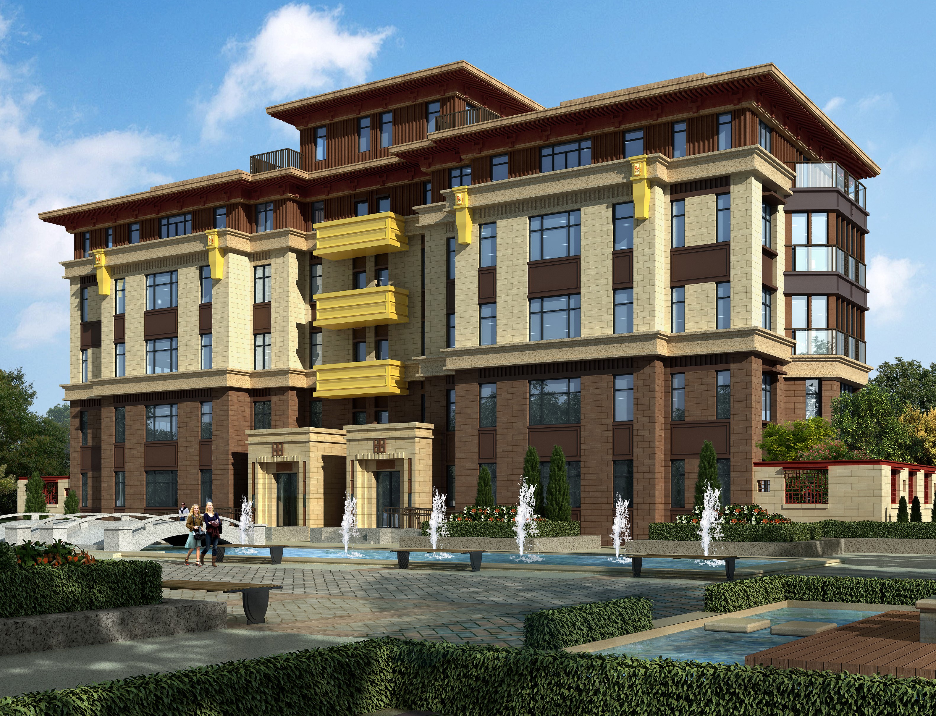 项目建筑采用新中式建筑风格,在沿袭中国传统建筑精粹的同时,更注重对现代生活价值的精雕细琢,着力提高居住的舒适度。空间结构上有意遵循了传统住宅的布局格式,但不循章守旧,与现代建筑完美相融,自成特色。项目遵循以人为本的筑家理念,引入多种智能科技及国际化设计理念。道路体系明晰,人车分流,水陆相间,路网通达,合理规划,完善布局。同时引入车辆出入管理系统、可视楼宇对讲系统、电梯智能停层系统、一卡通系统等世界领先的智能化安保技术。