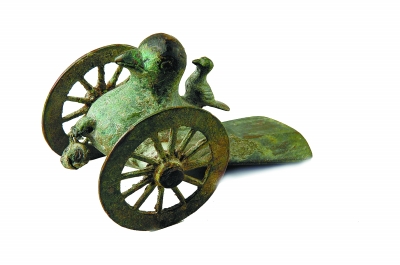 考古发掘中曾发现多件鸠车实物,材质以青铜为主,也有一些为陶制。出土的鸠车年代从汉代跨越到西晋时期,说明这一时期鸠车玩具比较流行。玩鸠车时,需要用线绳穿过鸠车胸前的小孔,牵拉线绳带动鸠车前进。如果拉得用力,鸠车的尾部就会翘起;如果轻轻拉动,鸠车的尾部则一直贴在地上。通过用力的大小,鸠车可以模仿鸠鸟飞翔和行走时的不同形态。