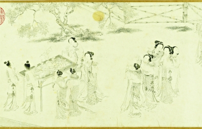 相传为明代仇英所绘的《乞巧图》中,供桌上放置的小人即为磨喝乐。