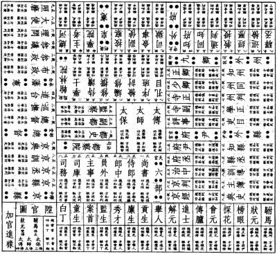 唐宋时期升官图又叫骰子选格,《南部新书》载:“李郃出贺州,人言不熟台阁,故著骰子选格。”李郃是唐代的状元,他为了让人们能够对朝廷机构更加熟悉,所以发明了骰子选格这一游戏,后来流传到明代即定名为“升官图”。如明代谢肇淛《五杂俎》中写道:“唐李郃有骰子选格,宋刘蒙叟、杨亿等有彩选格,即今升官图也。”