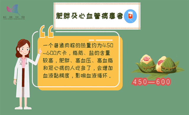 一个普通肉粽的热量约为450~600大卡,脂肪、盐的含量较高,肥胖、高血压、高血脂和冠心病的人吃多了,会增加血液黏稠度,影响血液循环,加重心脏负担和缺血程度,就有可能会诱发心绞痛。