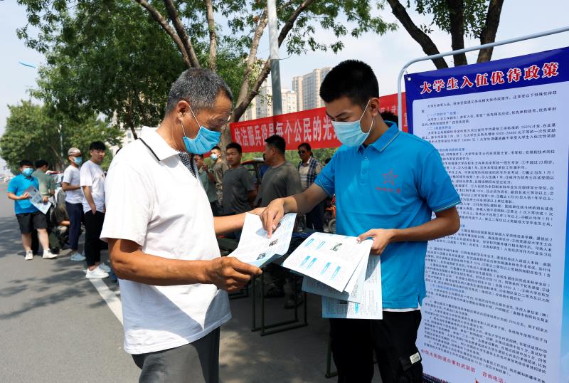 桃城区中华大街办事处工作人员为市民讲解入伍相关政策。