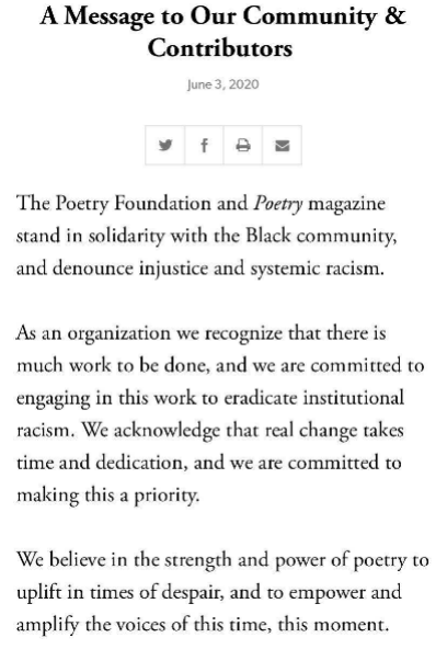 公开信称,“这一声明的态度模棱两可,似乎只是面对现实局势的权宜之计,如此模糊的立场相当于对黑人的种族灭绝,最终将呈现为一种暴力。我们要求诗歌基金会和诗歌杂志做得更多,做得更好,”信中要求主席和董事会主席辞职,并“为明确反种族主义性质的工作分配更多的财政资源”。诗人们说,在这些要求得到满足之前,他们不会向杂志社提交任何作品。公开信中还提到,长久以来,诗歌基金会就被要求将更多的资金分配给边缘群体创作者,但是基金会一直没有这样做。