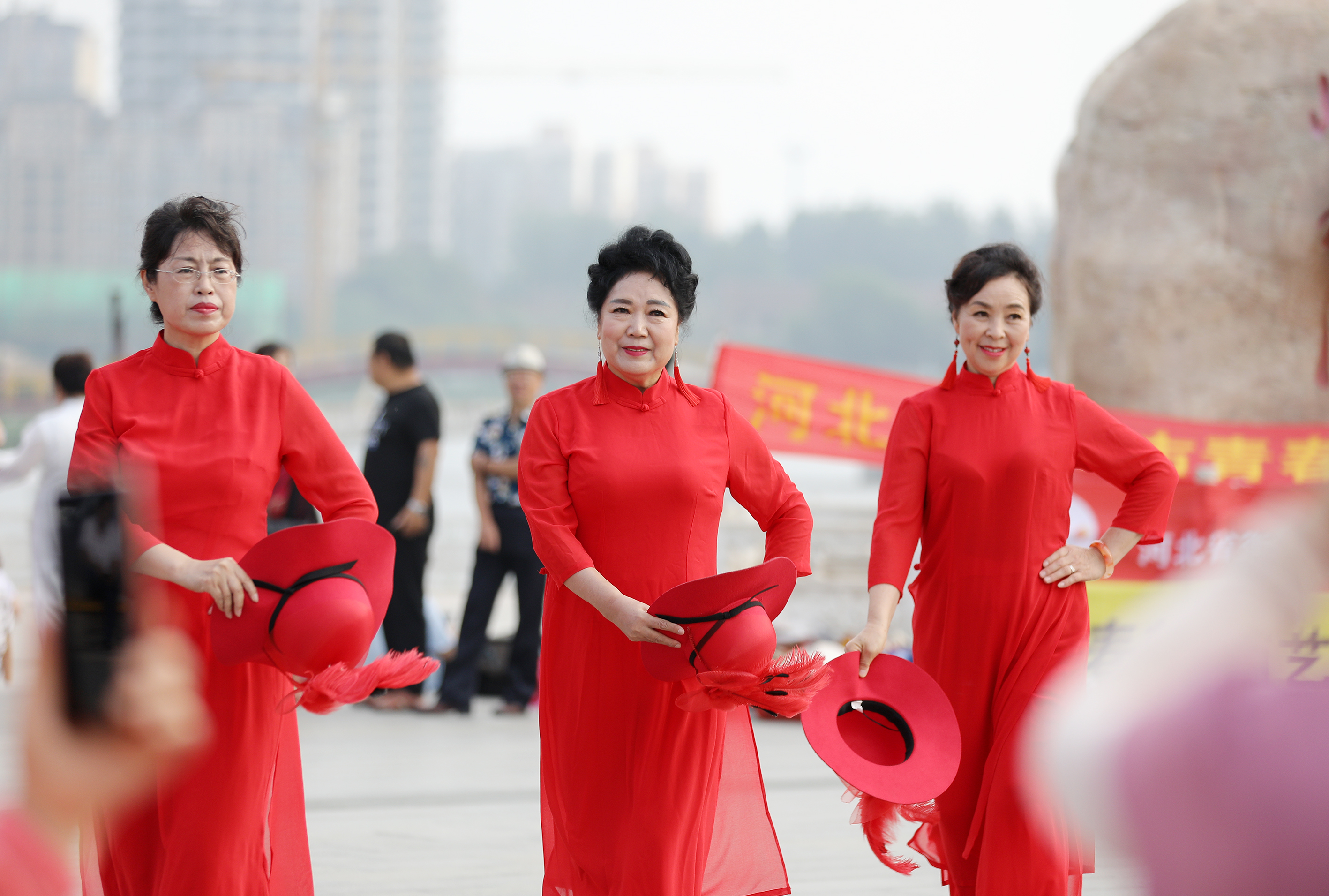 衡水市青春靓丽艺术团的老年队员在怡水园广场上表演。(无人机照片)
