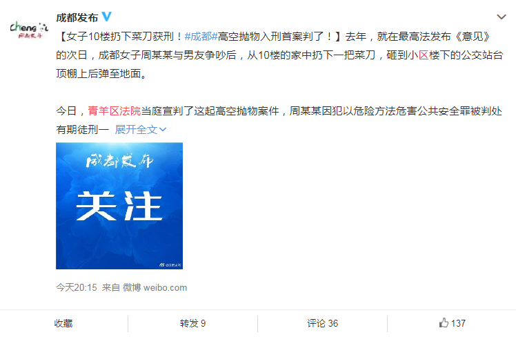 去年,就在最高法发布《意见》的次日,成都女子周某某与男友争吵后,从10楼的家中扔下一把菜刀,砸到小区楼下的公交站台顶棚上后弹至地面。