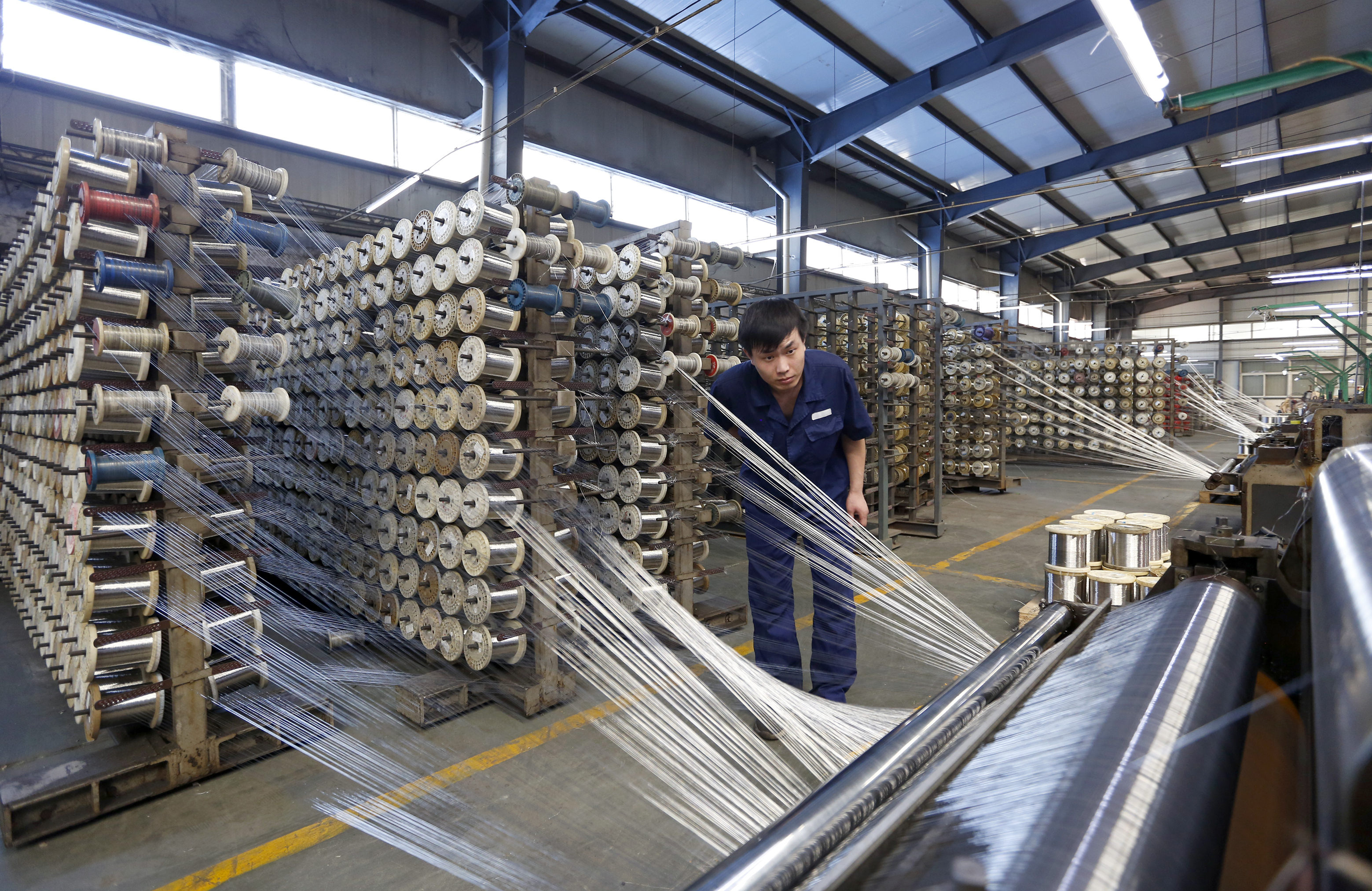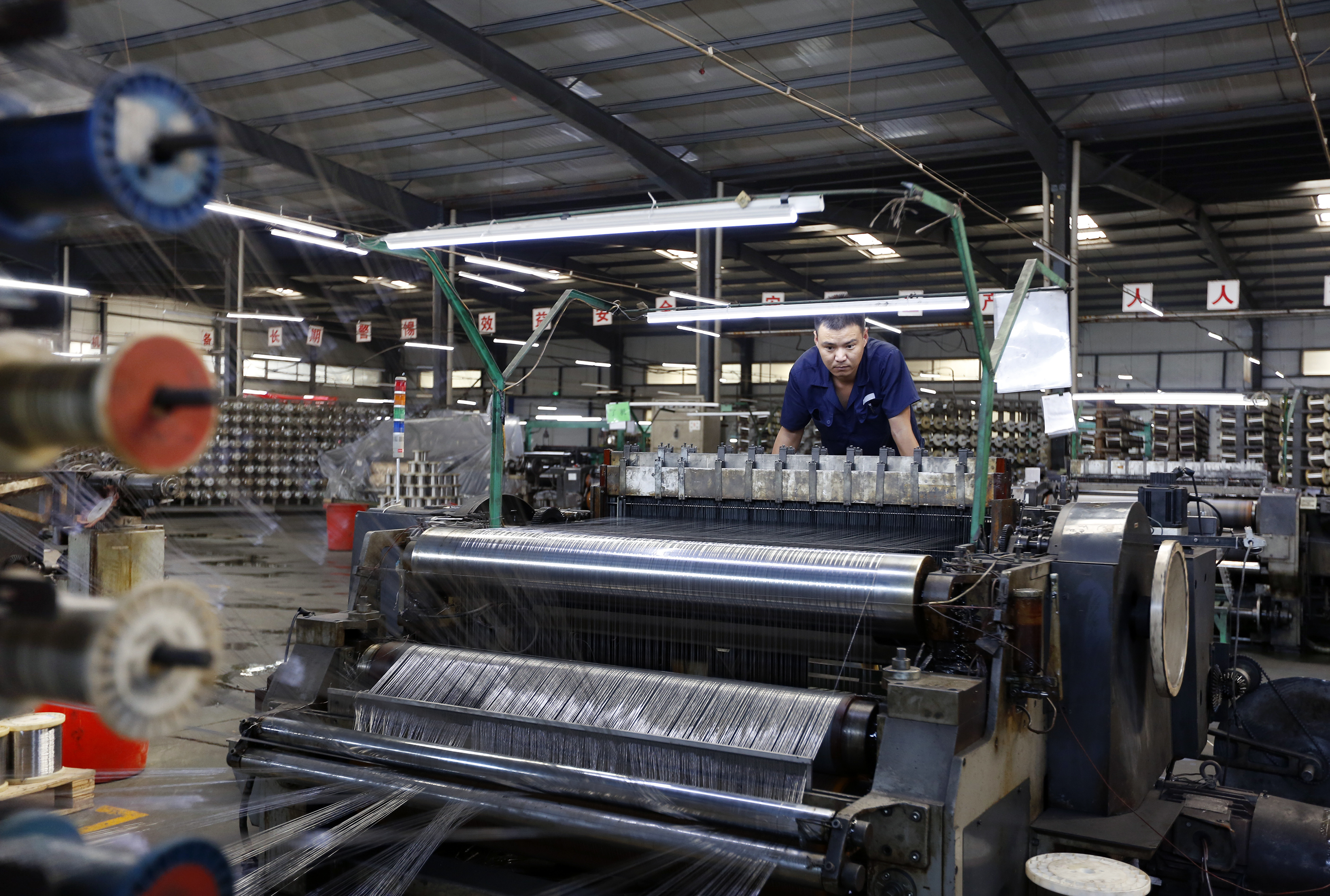安平县河北英凯模金属网有限公司车间工人查看机械设备。