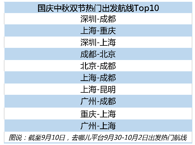 另外,目前十一假期机票预订量也已超过去年同期的九成。北上广深的游客更早预订出行机票。截至9月10日,十一假期热门出游航线Top10中,8条航线出发地为北上广深。目前,10月1日出发的北京-丽江、北京-大理、上海-西宁以及深圳-西宁的多个直飞航班仅剩全价经济舱或公务舱。