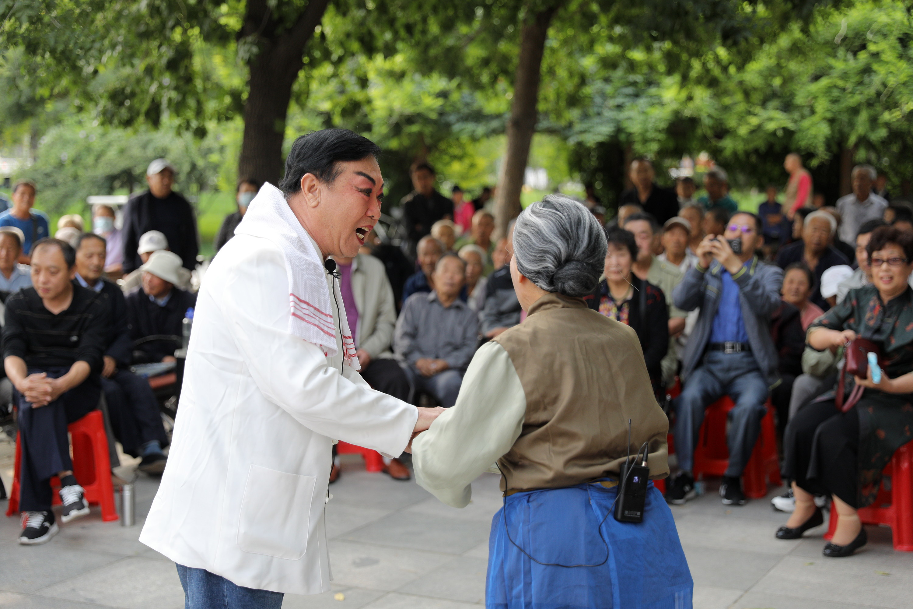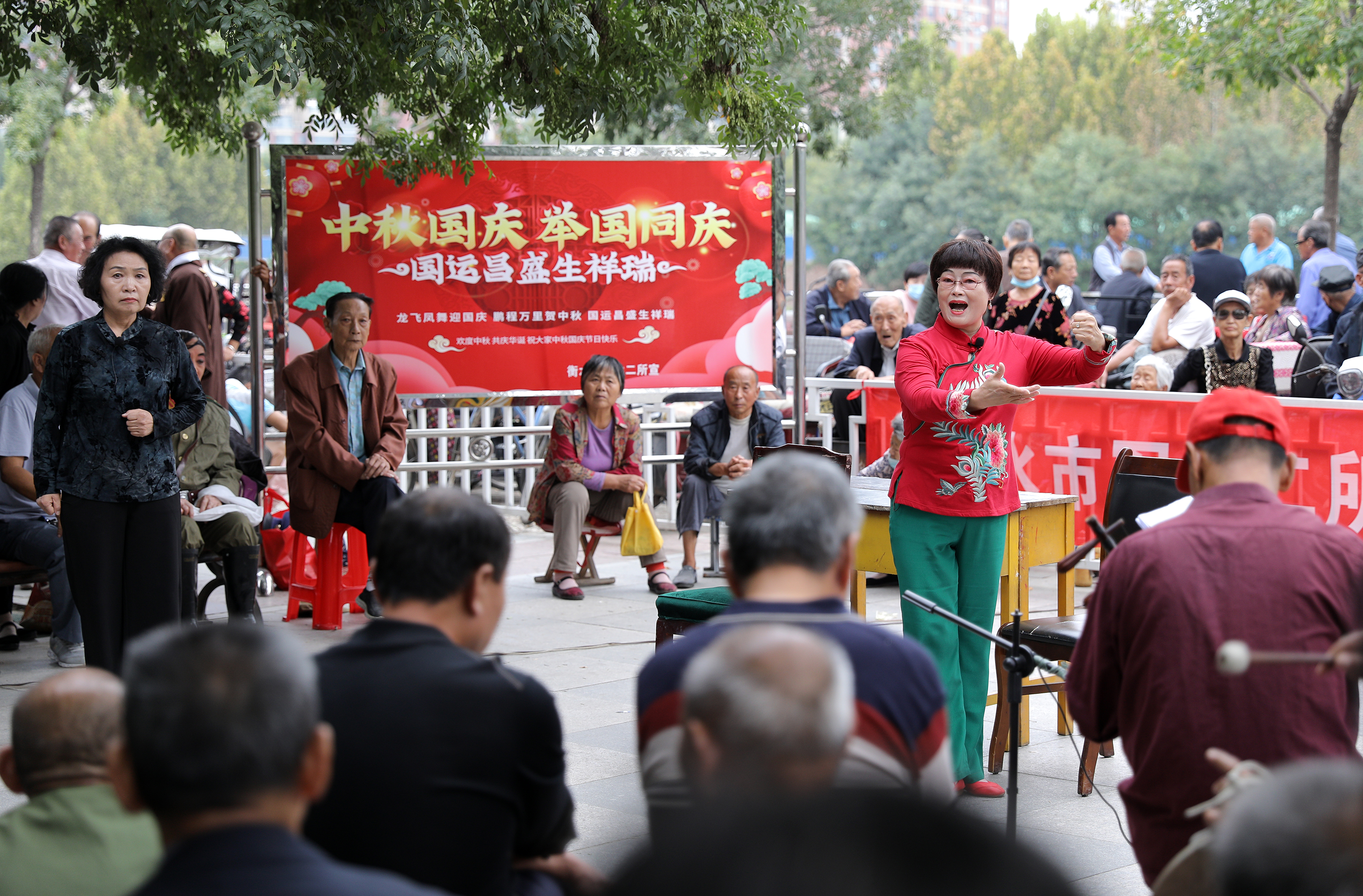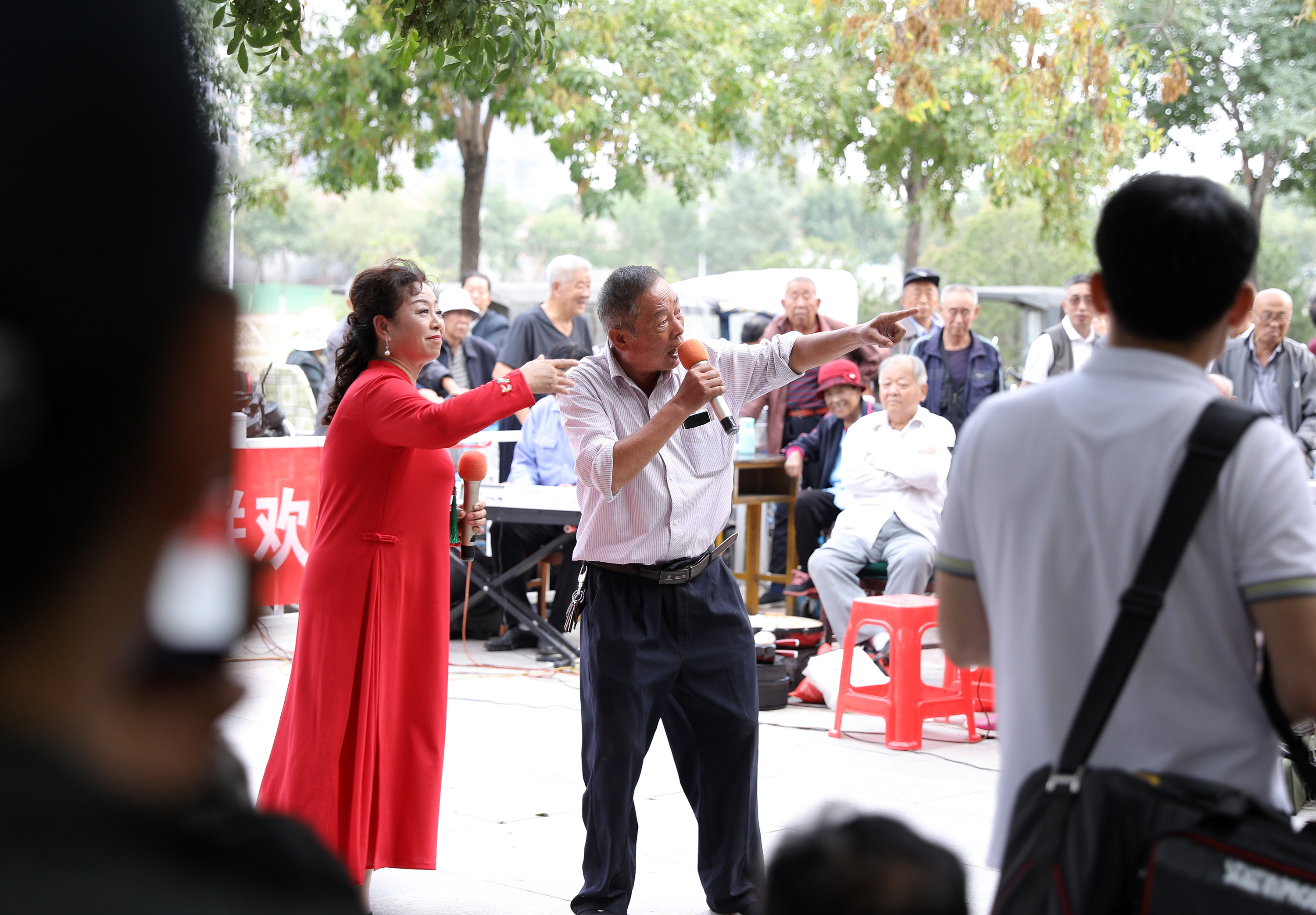 9月28日,戏曲爱好者正在为现场观众表演《沙家浜》选段。