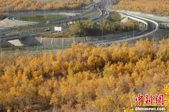 金色的胡杨、五彩斑斓的树木、曲曲弯弯的立交桥、落日时分的余晖与城市建筑交相辉映、美不胜收,成为市民休闲、健身的好场所。