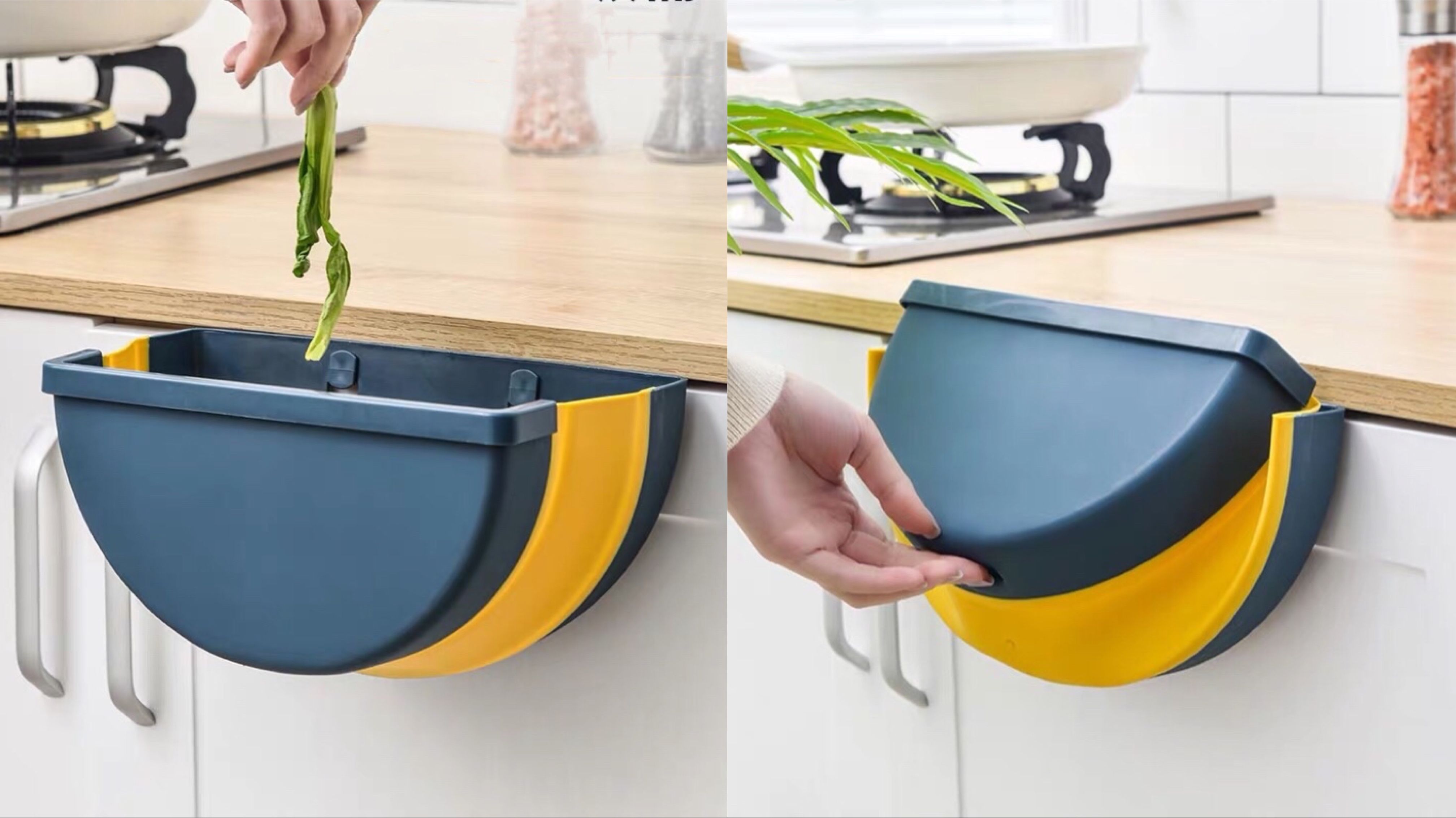 处理食材后的垃圾,可以不用弯腰就直接扔进垃圾桶,小小的方便让厨房忙碌的人们好感倍增。相比传统垃圾桶,这款可以在使用时展开,不用时折叠,不仅省空间,24厘米的宽口径便于清洗。可选择的两种悬挂方式,无论是粘贴还是通过卡槽悬挂,都免去墙壁打眼的麻烦。