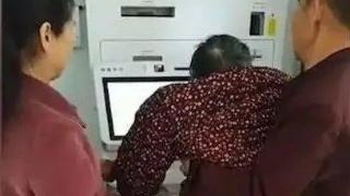 为了进行视频认证,这位年岁已高的老人被家人抱起来,膝盖弯曲,勉强进行人脸识别,十分吃力。