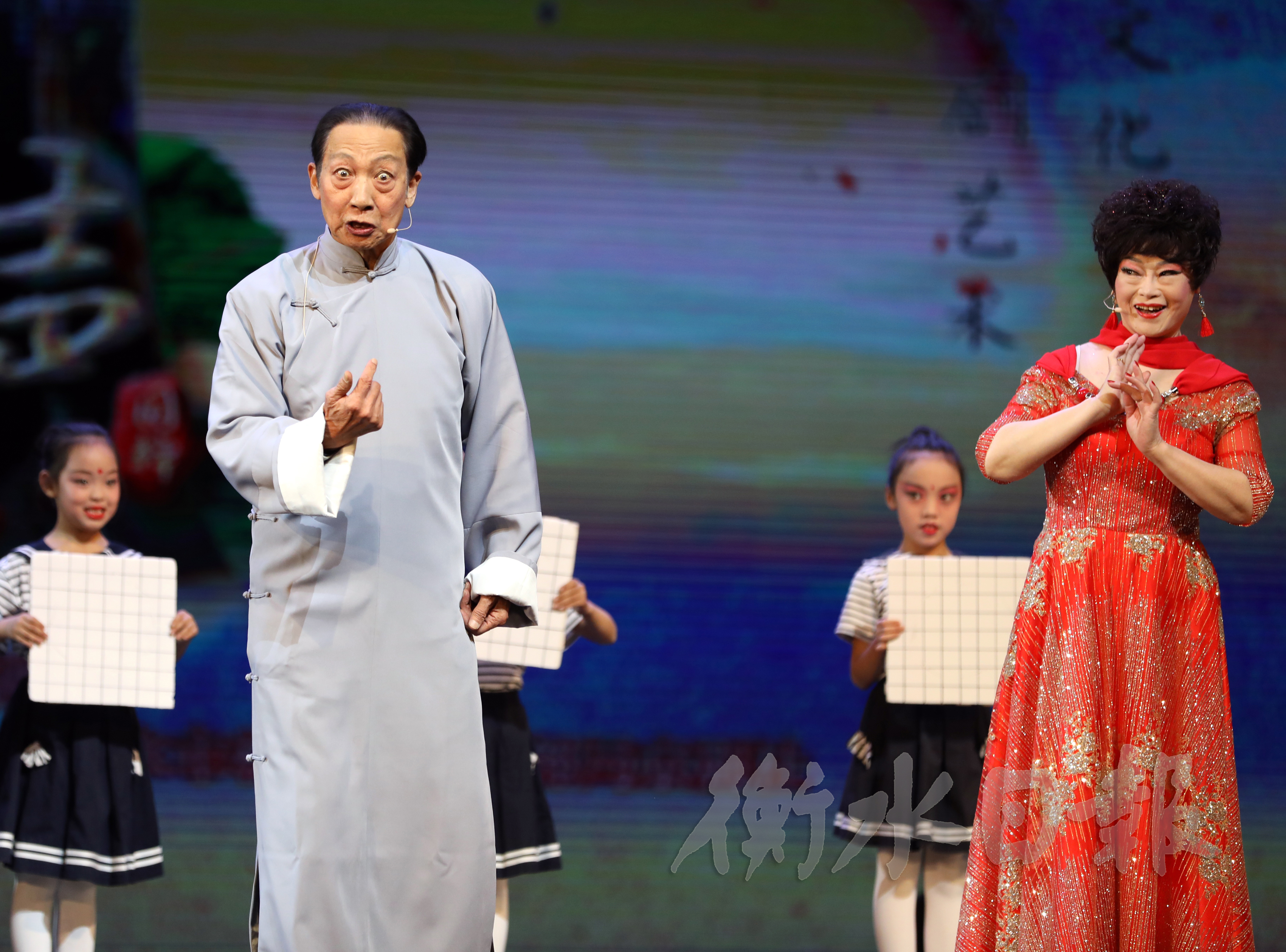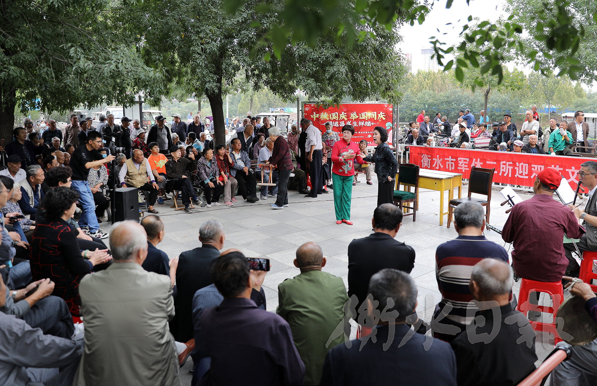 肖世明和陈荣段在杨树社区微剧场参加活动。