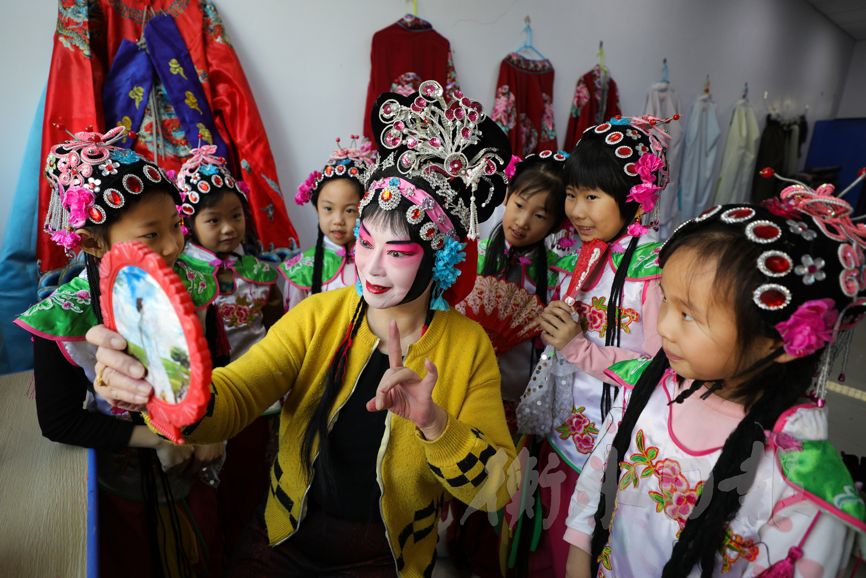 在胜利小学音乐舞蹈室,为了让孩子们全面感受京剧氛围,陈荣段打算来一次带妆排练。给孩子们逐一穿上戏服后,应邀前来的朋友帮陈荣段一起画妆。妆容初现,孩子们围着她,有的露出笑容,有的目不转睛……在另外一间教室,肖世明给学生们悉心指导着小生形体动作。