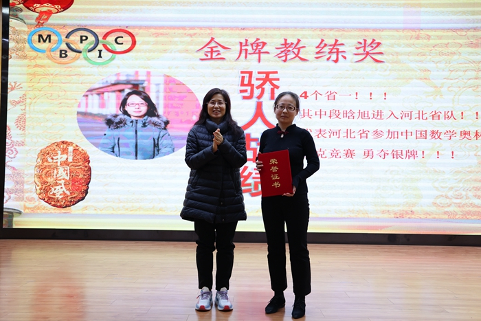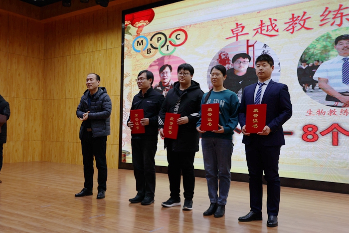 过去的一年,在全体教职员工的共同努力下,衡水二中奥赛部各项工作均取得了崭新成就。为总结经验、表彰先进,学校决定对在过去一年奥赛工作中取得卓越成绩和做出突出贡献的教练予以表彰,大会授予了奥赛部信息教练孟延灵、生物教练于鹏飞、化学教练刘京京、物理教练张存涛四位老师“卓越教练”称号,副校长伊长杰为四位老师颁奖;授予了奥赛部数学教练郝帆帆老师“金牌教练”称号,副校长王锦旭为郝老师颁奖。